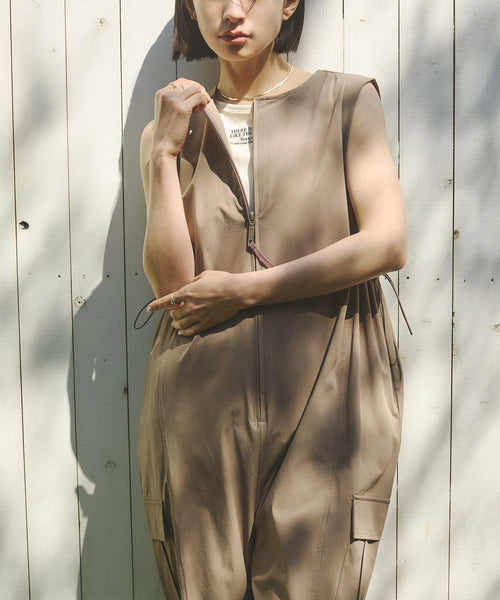 フロントジップ ウエストギャザー サロペット